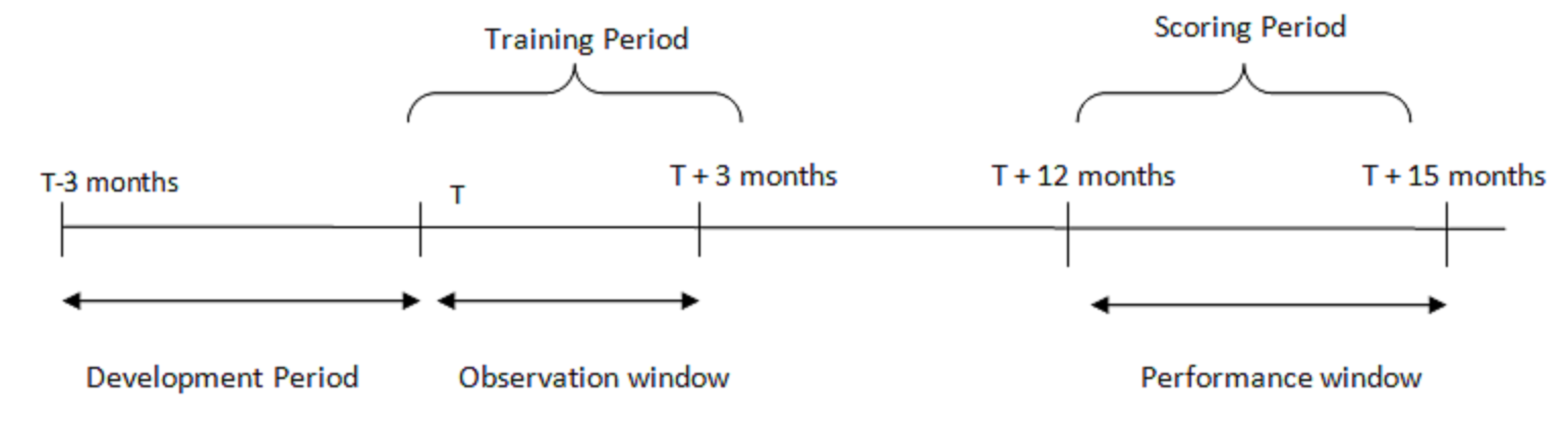 Observation period is used to populate independent variables in training window. Performance window is used to populate the dependent variable in training window. Development and scoring is the performance window of training and scoring respectively. Hope this helps.