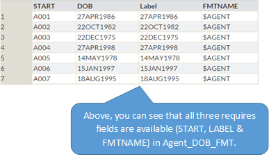 Here we want to create a format based on Agent_DOB and apply it to Sales. In Agent_DOB, we would consider AGT_ID (key field, between both datasets) as START, DOB as Label and FMTNAME =’ $AGENT’. Now look at the statements (below).