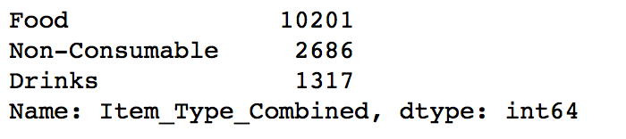 Earlier we saw that the Item_Type variable has 16 categories which might prove to be very useful in analysis. So its a good idea to combine them. One way could be to manually assign a new category to each. But there’s a catch here. If you look at the Item_Identifier, i.e. the unique ID of each item, it starts with either FD, DR or NC. If you see the categories, these look like being Food, Drinks and Non-Consumables. So I’ve used the Item_Identifier variable to create a new column: