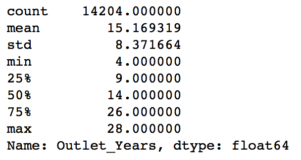 #Years: data['Outlet_Years'] = 2013 - data['Outlet_Establishment_Year'] data['Outlet_Years'].describe()
