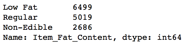 #Mark non-consumables as separate category in low_fat: data.loc[data['Item_Type_Combined']=="Non-Consumable",'Item_Fat_Content'] = "Non-Edible" data['Item_Fat_Content'].value_counts()
