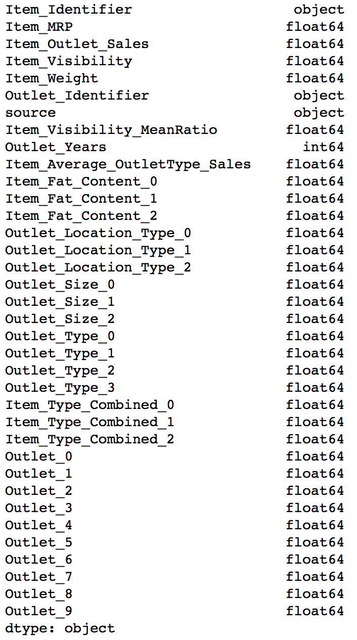 Since scikit-learn accepts only numerical variables, I converted all categories of nominal variables into numeric types. Also, I wanted Outlet_Identifier as a variable as well. So I created a new variable ‘Outlet’ same as Outlet_Identifier and coded that. Outlet_Identifier should remain as it is, because it will be required in the submission file.