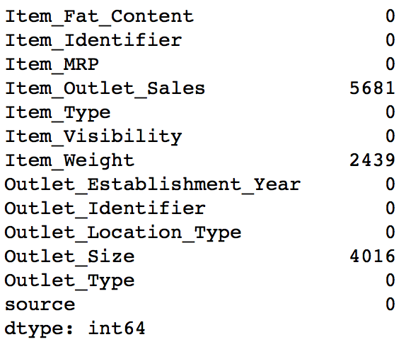 Note that the Item_Outlet_Sales is the target variable and missing values are ones in the test set. So we need not worry about it. But we’ll impute the missing values in Item_Weight and Outlet_Size in the data cleaning section.