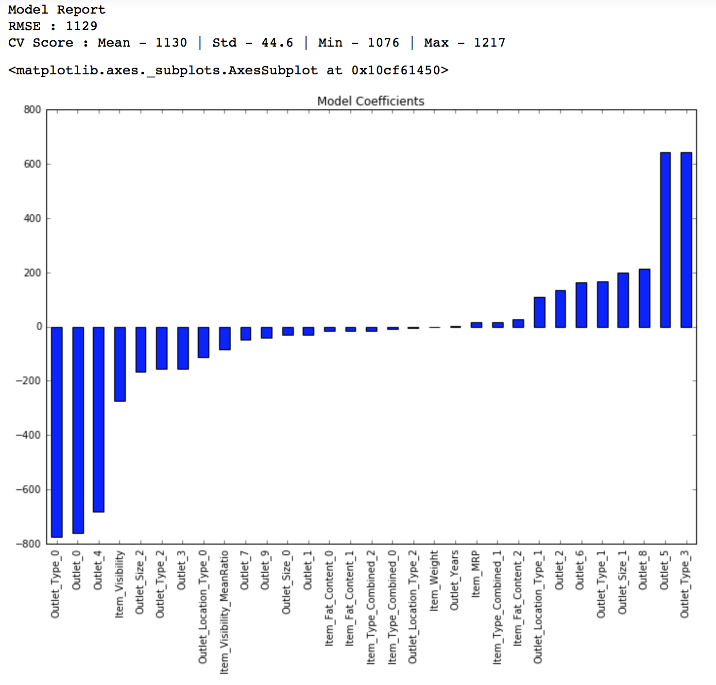 We can see this is better than baseline model. But if you notice the coefficients, they are very large in magnitude which signifies overfitting. To cater to this, lets use a ridge regression model. You should read this article if you wish to learn more about Ridge & Lasso regression techniques.