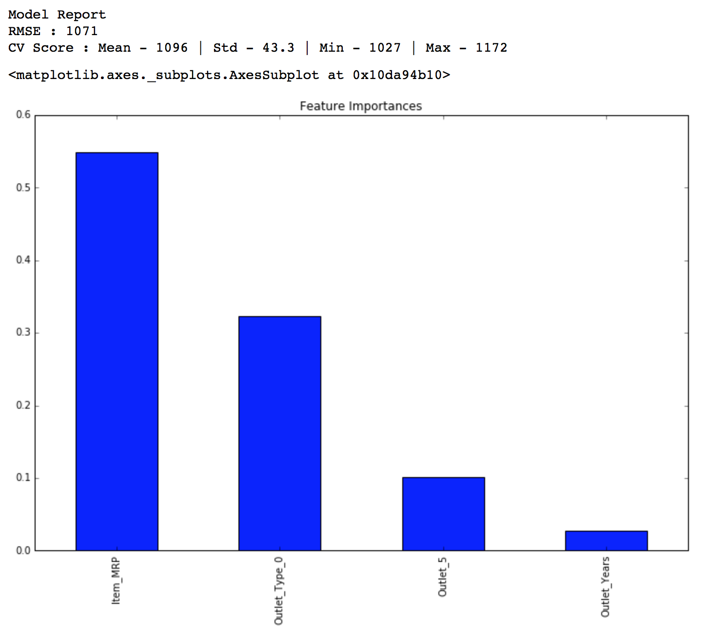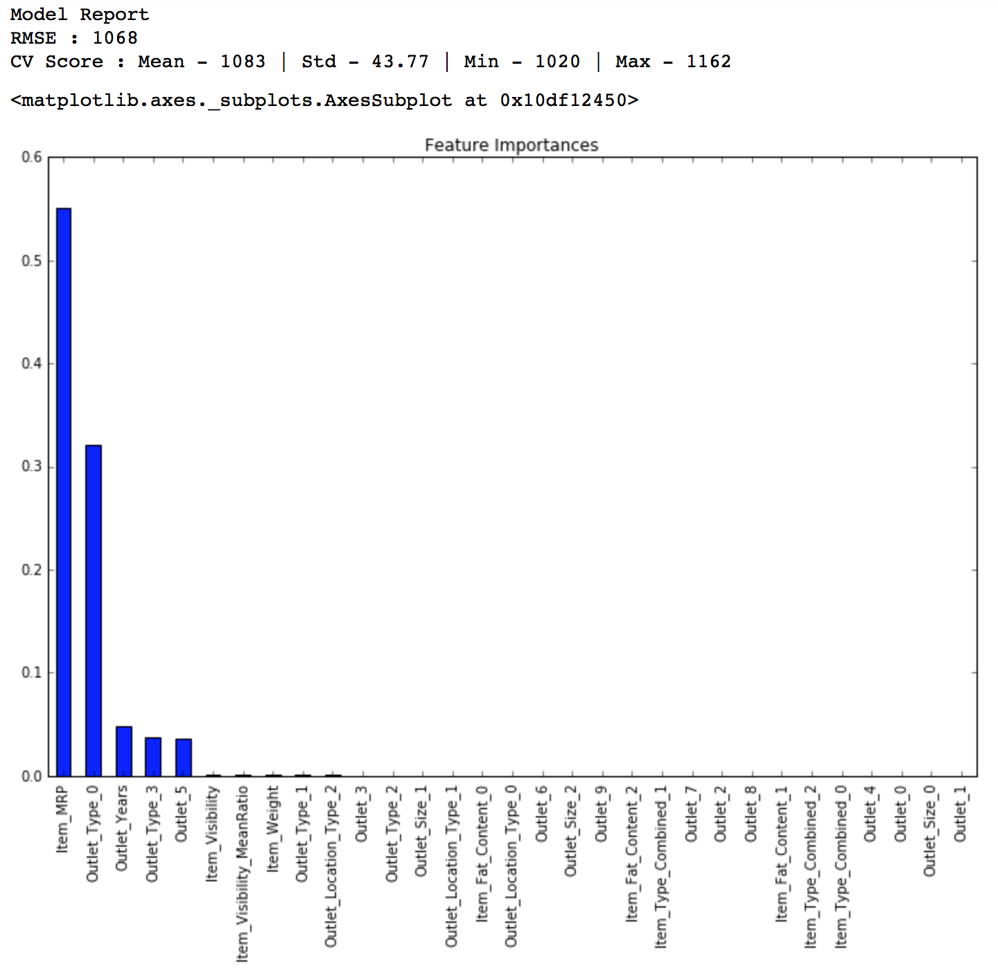 print "RMSE : %.4g" % np.sqrt(metrics.mean_squared_error(dtrain[target].values, dtrain_predictions))