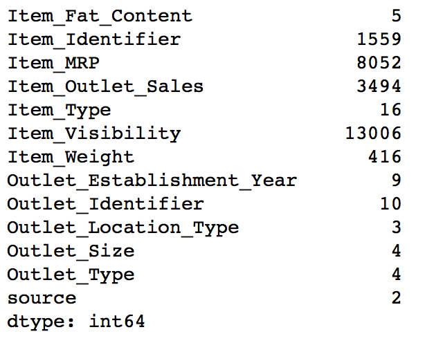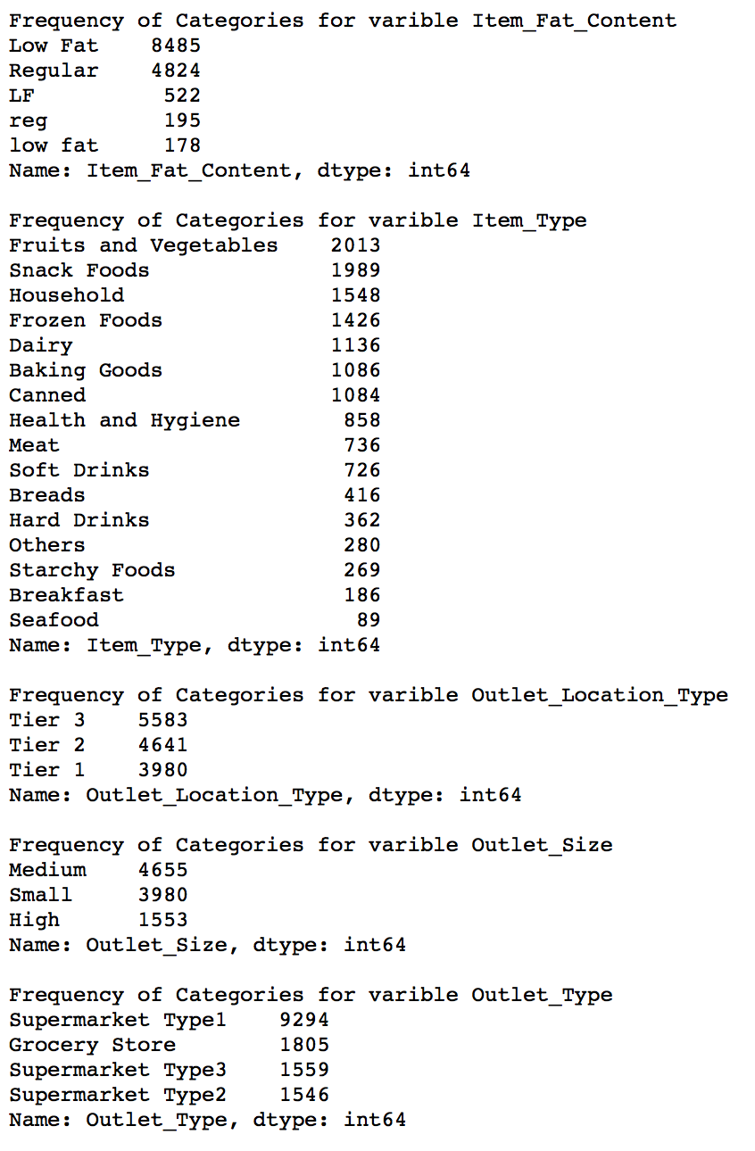 This tells us that there are 1559 products and 10 outlets/stores (which was also mentioned in problem statement). Another thing that should catch attention is that Item_Type has 16 unique values. Let’s explore further using the frequency of different categories in each nominal variable. I’ll exclude the ID and source variables for obvious reasons.