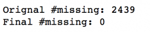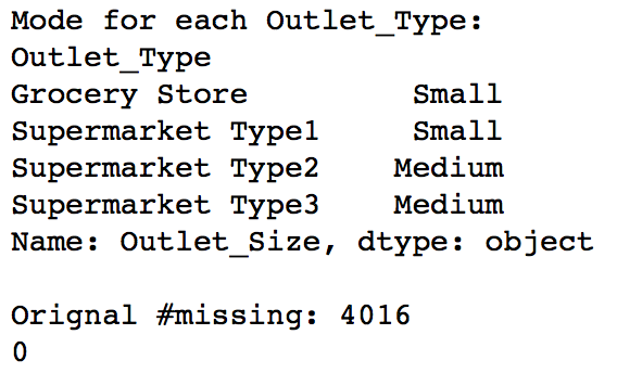 #Import mode function: from scipy.stats import mode #Determing the mode for each outlet_size_mode = data.pivot_table(values='Outlet_Size', columns='Outlet_Type',aggfunc=(lambda x:mode(x).mode[0]) ) print 'Mode for each Outlet_Type:' print outlet_size_mode #Get a boolean variable specifying missing Item_Weight values miss_bool = data['Outlet_Size'].isnull() #Impute data and check #missing values before and after imputation to confirm print '\nOrignal #missing: %d'% sum(miss_bool) data.loc[miss_bool,'Outlet_Size'] = data.loc[miss_bool,'Outlet_Type'].apply(lambda x: outlet_size_mode[x]) print sum(data['Outlet_Size'].isnull())
