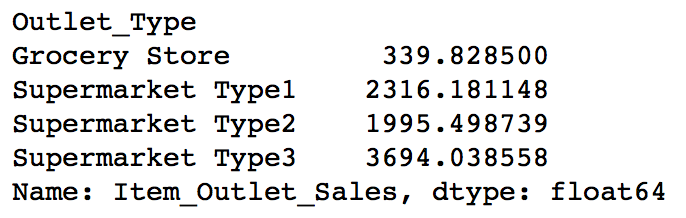 During exploration, we decided to consider combining the Supermarket Type2 and Type3 variables. But is that a good idea? A quick way to check that could be to analyze the mean sales by type of store. If they have similar sales, then keeping them separate won’t help much.