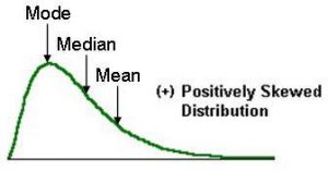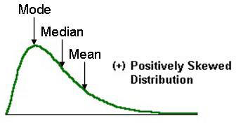 In skewed distributions the mean will be in one extreme(towards the skew) and mode in the other. Whereas the median lies in the centre. In this case mean lies towards the right(the skew).