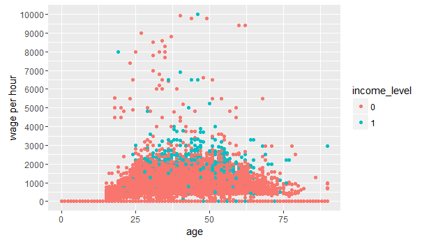 > ggplot(data=num_train,aes(x = age, y=wage_per_hour))+geom_point(aes(colour=income_level))+scale_y_continuous("wage per hour", breaks = seq(0,10000,1000))
