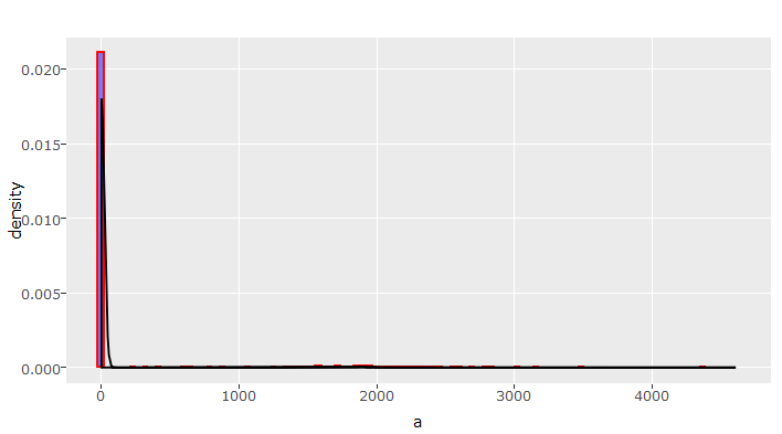 ggplot(data = num_train, aes(x= a, y=..density..)) + geom_histogram(fill="blue",color="red",alpha = 0.5,bins =100) + geom_density()