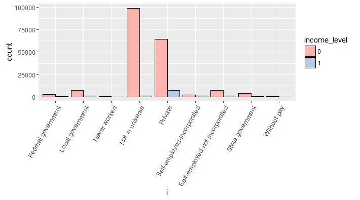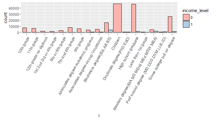 ggplot(cat_train,aes(x=i,fill=income_level))+geom_bar(position = "dodge", color="black")+scale_fill_brewer(palette = "Pastel1")+theme(axis.text.x =element_text(angle = 60,hjust = 1,size=10))