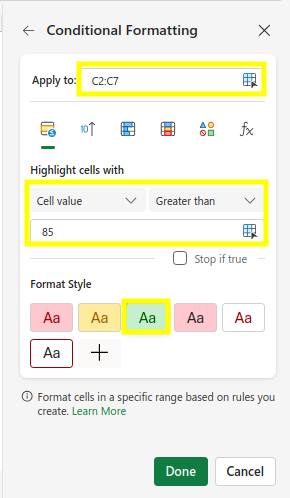 “Apply Conditional Formatting to highlight all students with grades above 85.”