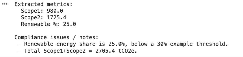 This simple function identifies any rules that have been violated. In real life, you would perhaps get rules from a knowledge base or configuration. Compliance checks are frequently divided into roles in agent-based systems. The Criteria/Mapping agents link the data that has been extracted to the specific disclosure fields or the criteria of the taxonomy while the Calculation agents carry out the numeric checks or conversions. To cite an example, one of the agents could check if a particular activity conforms to the “Do No Significant Harm” criteria set by the Taxonomy or could derive total emissions by means of text-to-SQL queries.