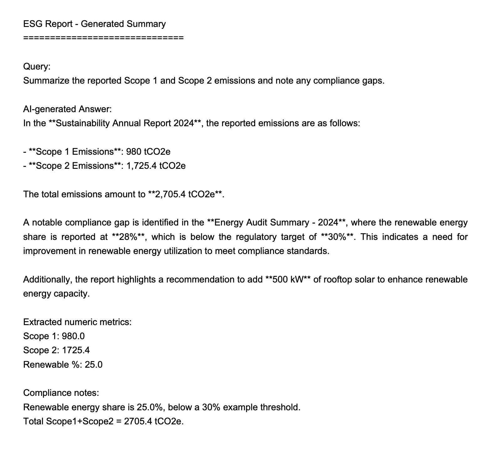 Alternatively, you can build a chained RetrievalQA or agent that pulls from the indexed documents and data, then calls the LLM to write each section. For example, using LangChain’s RetrievalQA as above, you could ask the agent to “Summarize Scope 1 and 2 emissions and highlight any compliance gaps.” The key is that every answer can cite sources or methods, enabling an evidence trail .