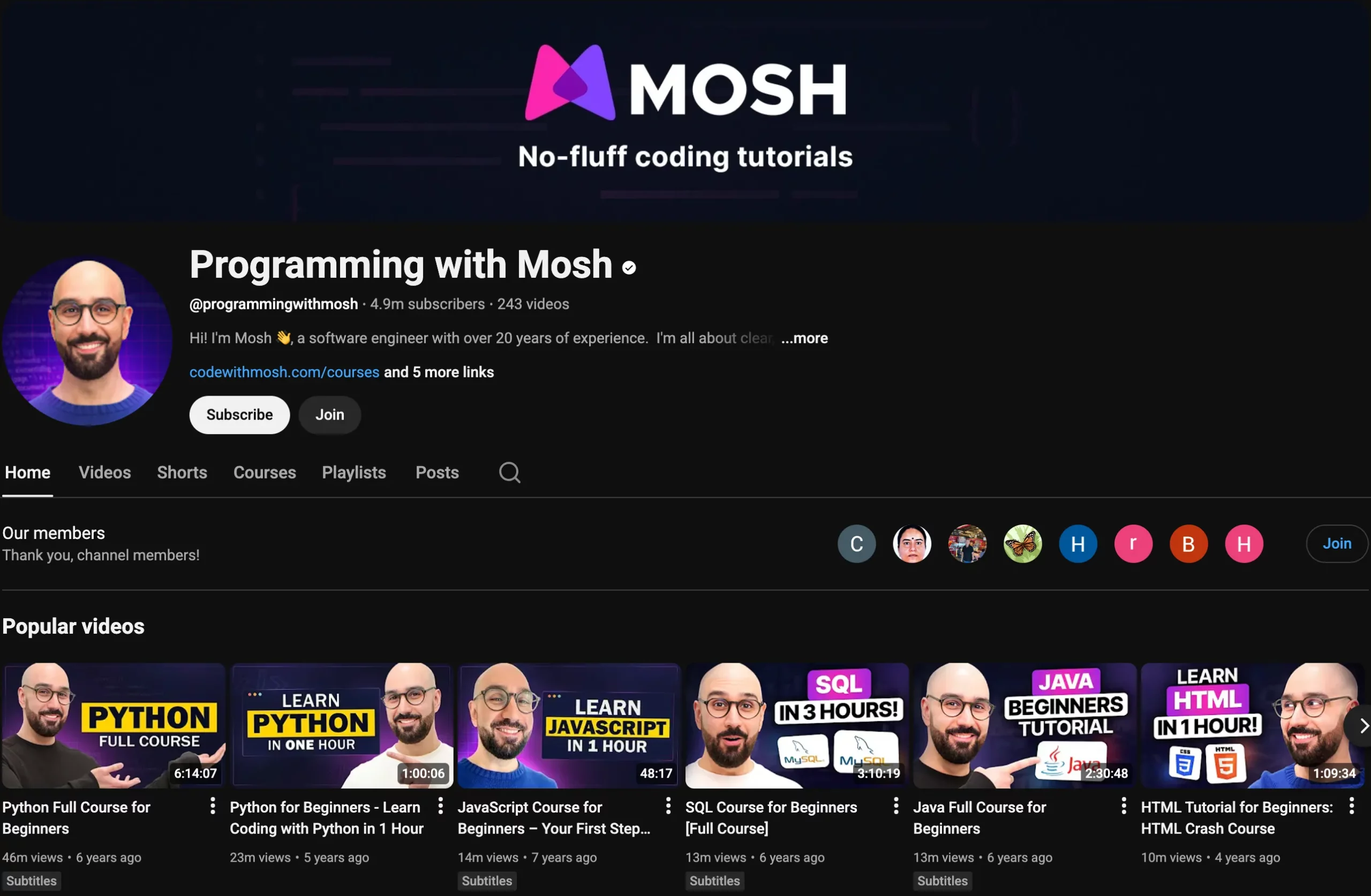 Programming with Mosh is known for calm, structured teaching, and his SQL content follows the same style. Concepts are introduced gradually and reinforced with simple examples. It has been the go-to YouTube channel for the internet, when it comes to programming languages.
