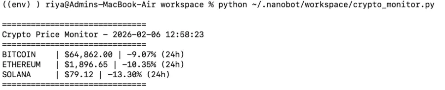 Instead of manually writing code, let nanobot’s AI agent build a cryptocurrency monitoring tool for you through natural conversation.