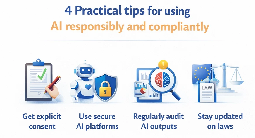 Treat AI compliance as a recurring task. Laws around data privacy and AI use evolve frequently, so review applicable regulations in your operating regions every quarter.