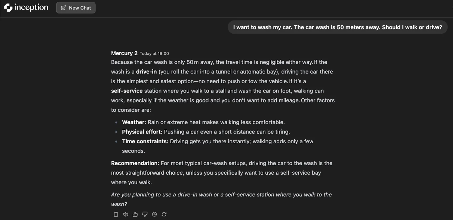 “I want to wash my car. The car wash is 50 meters away. Should I walk or drive?”