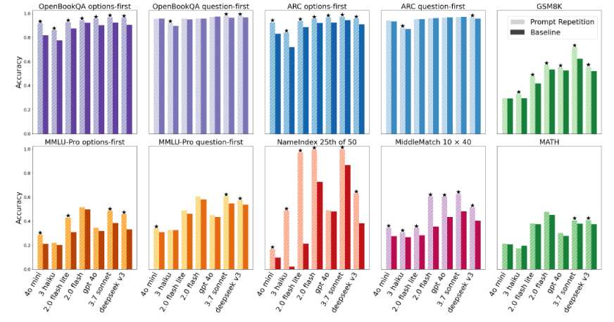 In the experiments, when reasoning prompts were used, repetition produced mostly neutral results. That makes sense. If the model is already revisiting the question during its reasoning process, duplicating the prompt adds little new information.