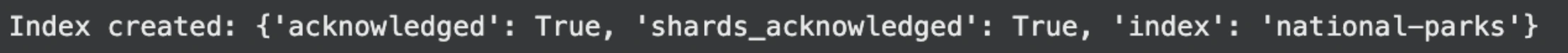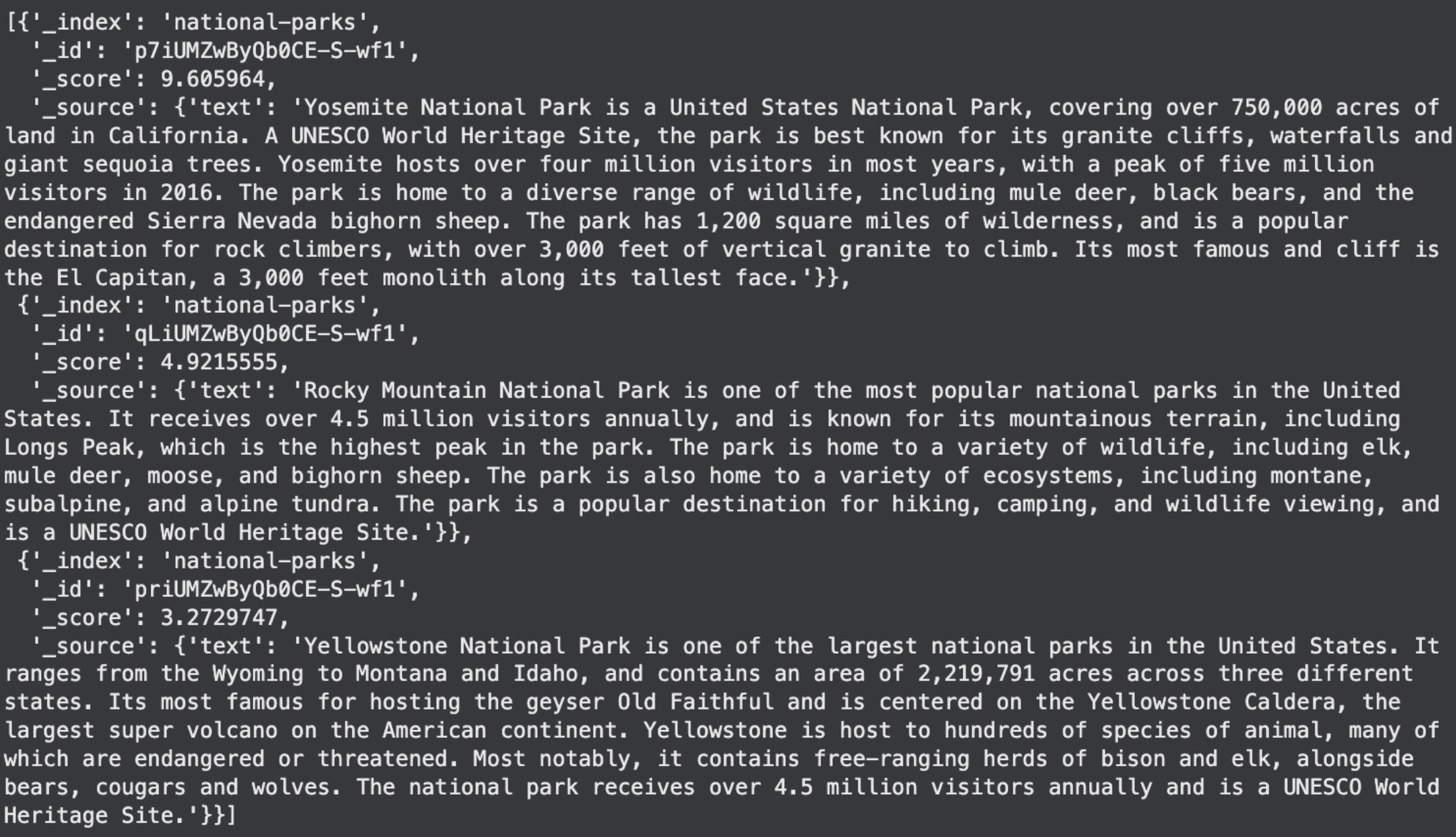 These documents are plain text. Each document describes a national park. Elasticsearch will convert each text entry into a semantic embedding internally.