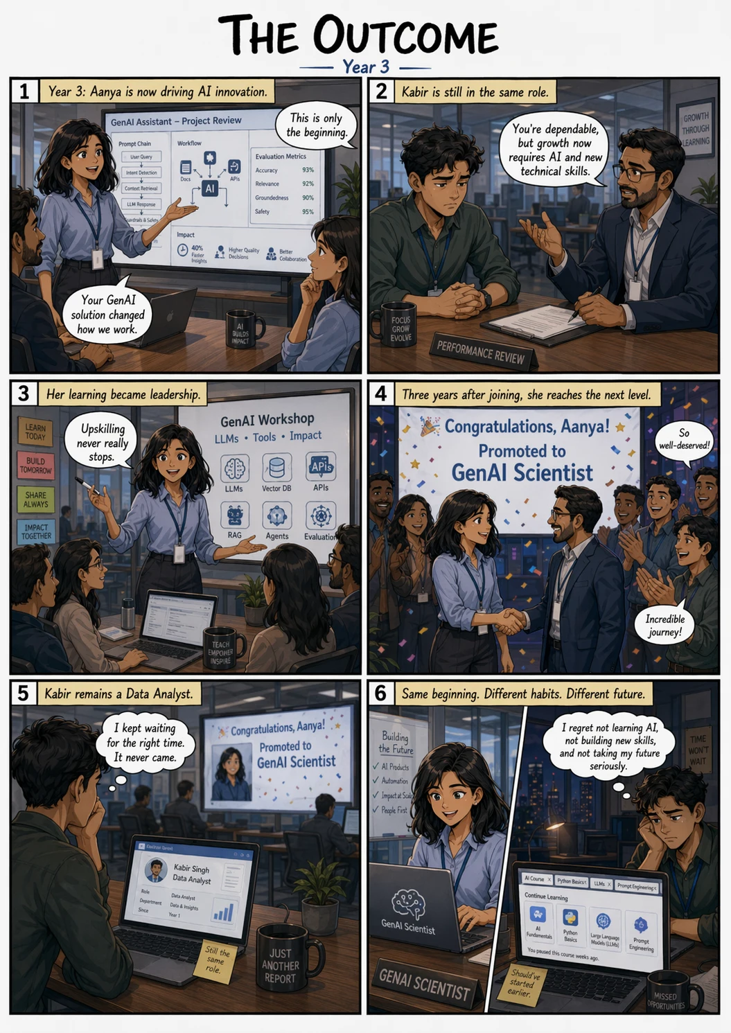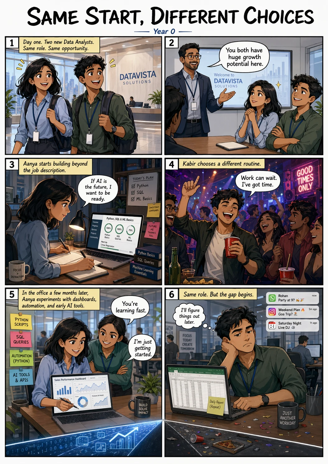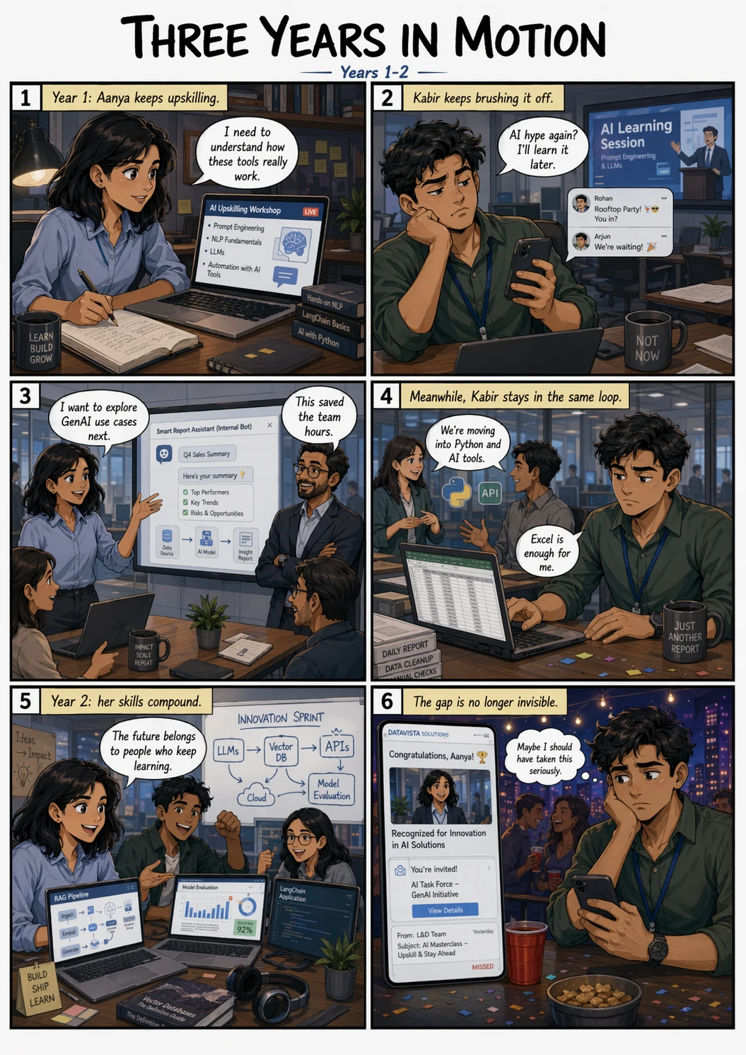 Create a 3-page comic book script with 15+ scenes following two employees who join the same company as Data Analysts. The story must visually contrast their paths over three years: one employee is shown constantly upskilling, mastering AI tools, and upgrading their technical knowledge, while the other is depicted frequently partying and neglecting professional growth. The finale should show the first employee successfully promoted to a GenAI Scientist, while the second remains a Data Analyst, reflecting on their choices with deep regret for not learning AI and new skills.